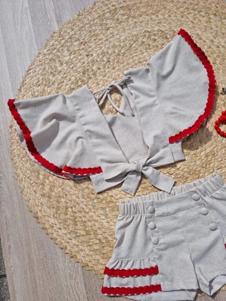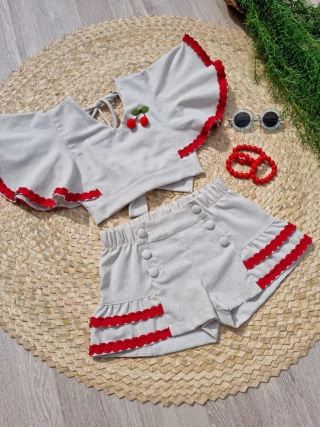 Conjunto cereja ( blusinha malha, shorts saia tricoline listrada )