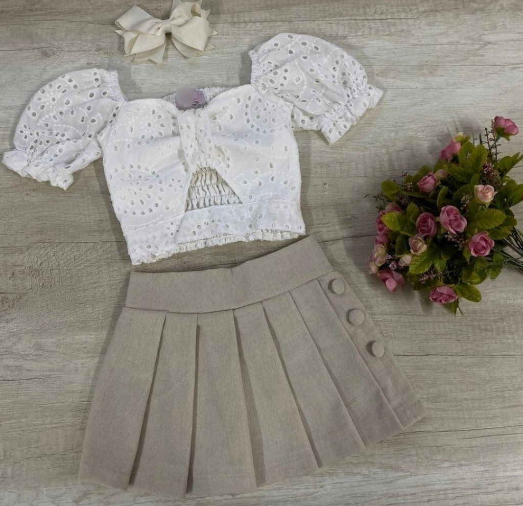 Conjunto Joana ( cropped em laise 100% algodão, shorts saia em linho preguinhas)